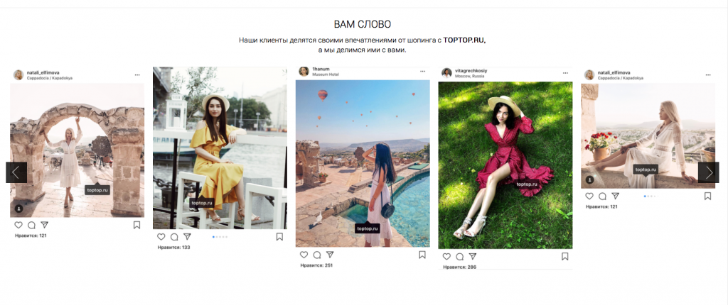 Например, встроить реальные отзывы с фотографиями в вашей одежде и с вашими аксессуарами на сайт. Главное, чтобы все отзывы были кликабельны, а по ссылке можно было перейти на реальный отзыв в Instagram или другую социальную сеть.