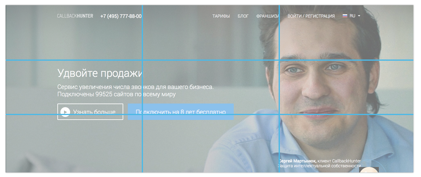 Например, посмотрите на страницу сервиса Callbackhunter. Кнопка «Подключить на 8 лет бесплатно» находится на нижнем левом перекрестке: