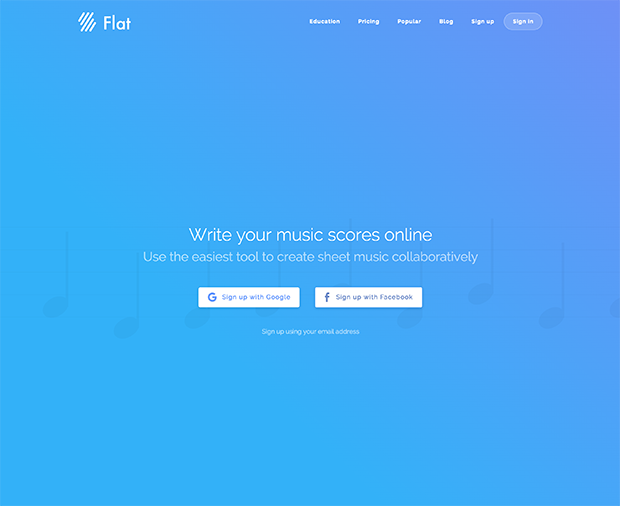 Flat.io использует огромное количество отрицательного пространства на своей домашней странице, чтобы удержать внимание пользователя на главном призыве к действию — войти при помощи Google или Facebook.