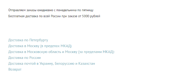 Вы решили, что незачем подробно расписывать все способы доставки и оплаты, а между тем это практически первое, на что смотрит посетитель магазина. Если ему непонятно, как оплачивать или получать посылку из вашего магазина, проще уйти в другой.