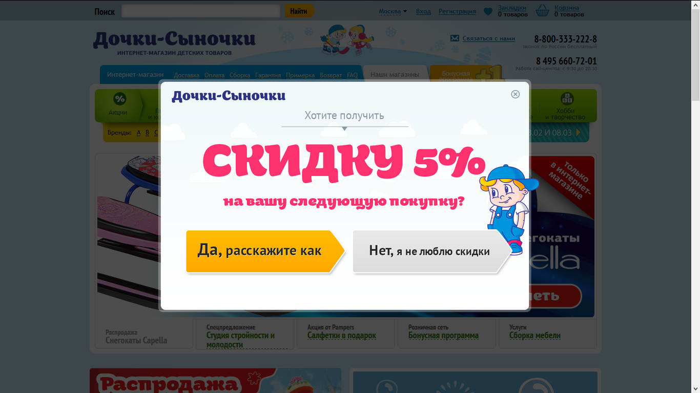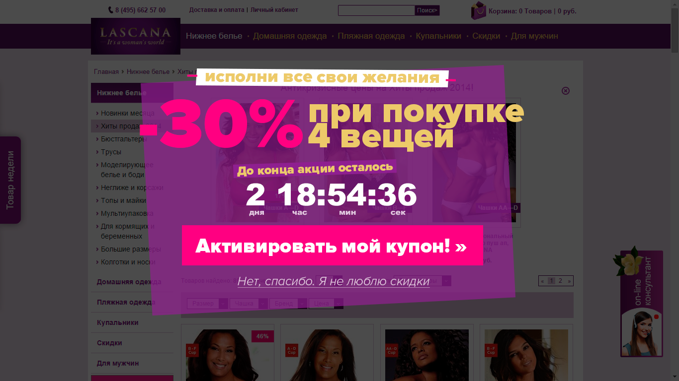 Если же пользователь изначально попал на внутреннюю страницу (например, перешел из контекстной рекламы сразу на карточку товара), то об акции он так и не узнает. Поэтому, необходимо убедиться, что о вашей акции узнают все посетители, вне зависимости от того, на какую страницу они попали при входе на сайт.