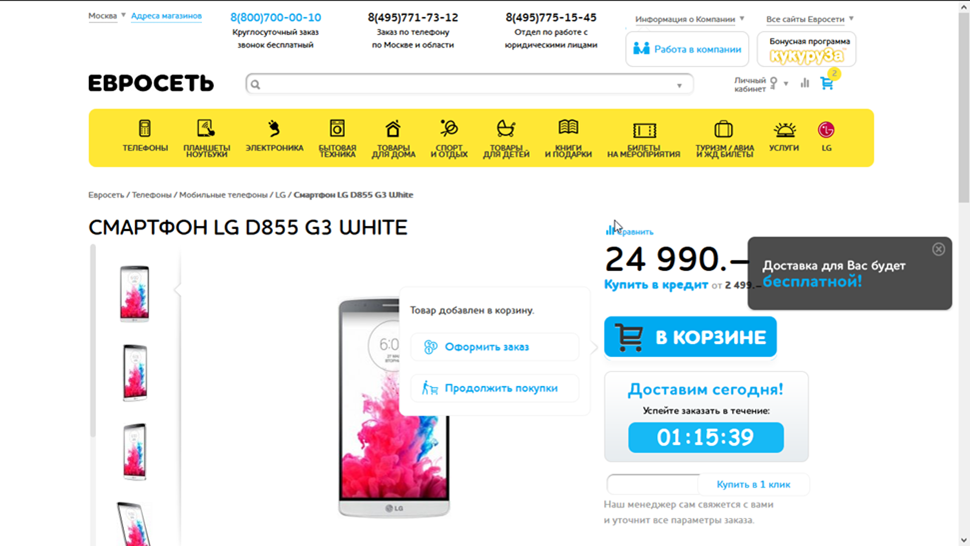 Изображение 10: Пример сообщения на сайте Евросеть (при добавлении в корзину товаров на сумму более 2500 рублей)[/caption]