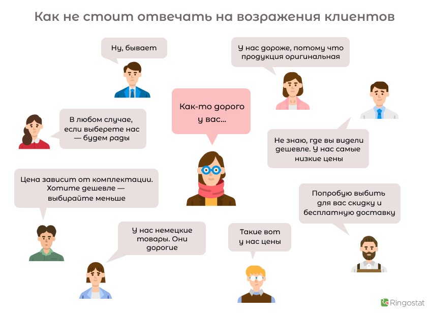 В любой сфере есть клиенты, которые говорят: «Слишком дорого». Неправильная тактика — отвечать на это, как показано ниже. Кстати, это ответы по мотивам реальных событий, и многие из них мы встречали, будучи тайными покупателями: