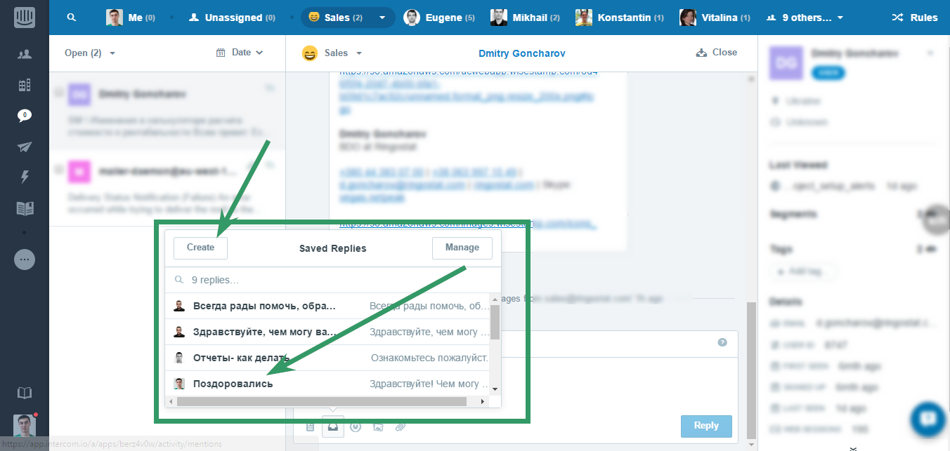 Посетитель сайта, обратившийся в чат, не будет ждать ответа две-три минуты. У вас совсем мало времени, чтобы установить контакт. Поэтому в течение 20 секунд нужно, как минимум, поздороваться. Например, мы для этого используем шаблонные заготовки в коммуникационной платформе Intercom.