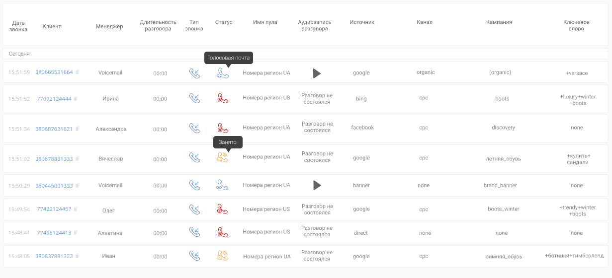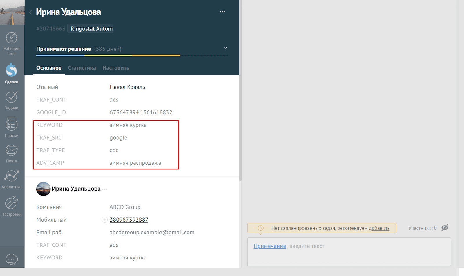 если у вас подключен коллтрекинг — в сделку передастся информация о рекламе, которая привела к звонку: источник, канал, кампания и ключевое слово;