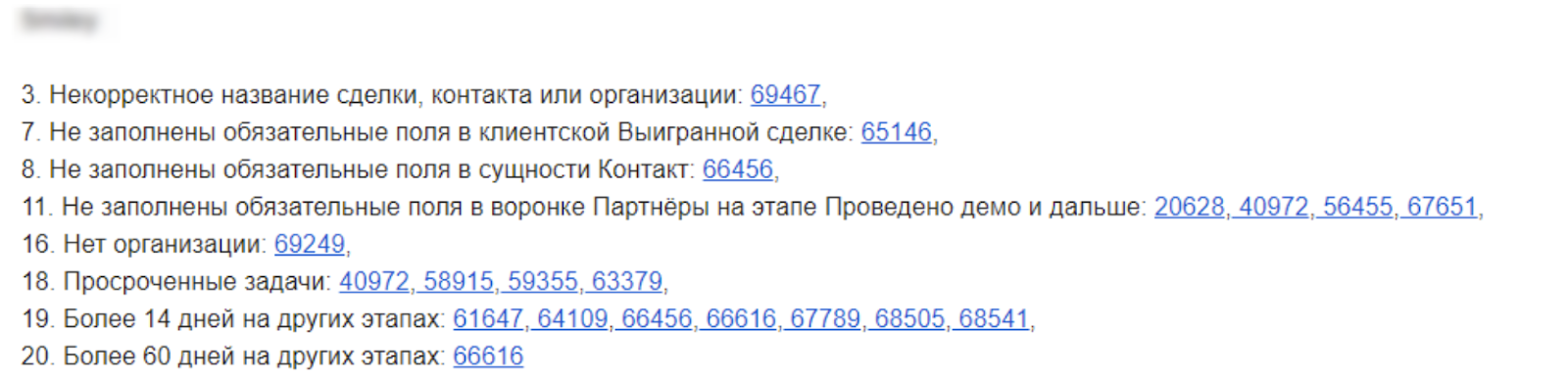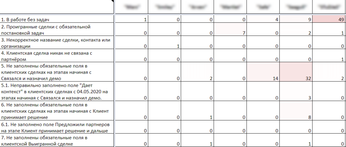 у нас есть автоматическая выгрузка раз в неделю по тому, какие ошибки допускают менеджеры при ведении CRM — как ее сделать, мы описали в статье;