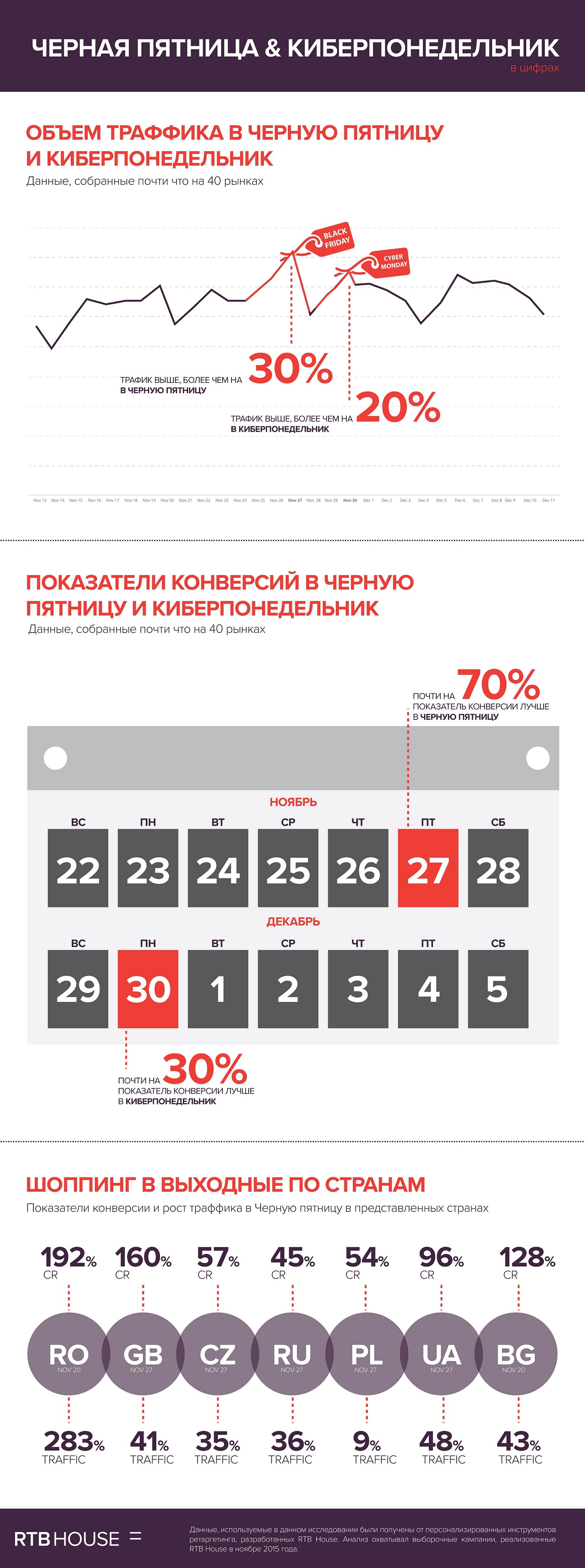 Анализ кампаний RTB House, проведенный почти на 40 рекламных рынках, показал, что клиентские кампании дают улучшение результата на 70% в «Черную пятницу» и около 30% в Киберпонедельник. Эти цифры даны в сравнении со средним результатом за ноябрь 2015 г. Согласно данным, полученным с помощью инструментов персонализированного ретаргетинга, разработанных компанией, суммарный трафик на веб-сайтах также превзошел средние значения на 30% в «Черную пятницу» и соответственно на 20% в Киберпонедельник.