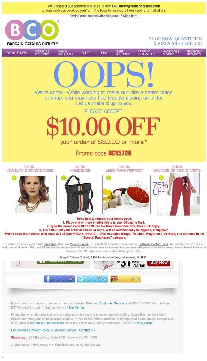 Письмо извинение. Согласитесь, в вашем магазине довольно часто бывают какие-либо ошибки или нестыковки с ценами, названиями или наличием товара. Несмотря на это, ваши покупатели умудряются заказать товар, которого нет на складе или цена к которому выставлена не правильно. Большинство магазинов в данном случае обходится автоматическим письмом об "отмене заказа и обнулении его статуса", что в корне неправильно. Данное письмо призвано не только извиниться за них, но и мотивировать покупателям на совершение других покупок. Дословный перевод звучит примерно так: "мы проводили тех. работы по сайту, чтобы сделать его лучшим местом для покупок, поэтому у вас могли быть проблемы с оформлением заказа. Примите $10 в качестве бонуса на покупку. Бонус выдается купоном, причем заметьте - программа рассчитана на средний чек выше $30. Отличное решение.
