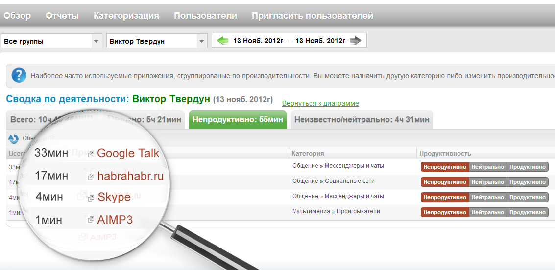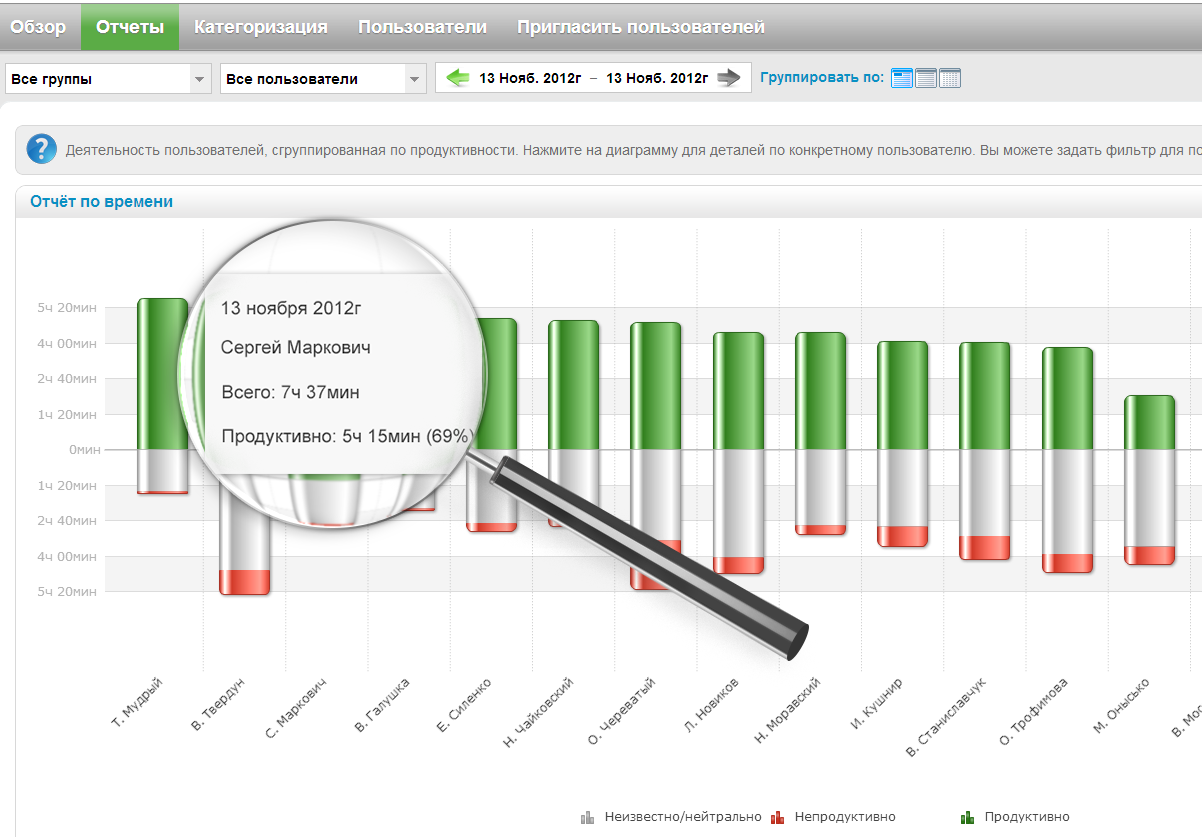 Отчёты по статистике позволяют провести как детальный анализ рабочего дня каждого сотрудника, так и составить общую картину.”