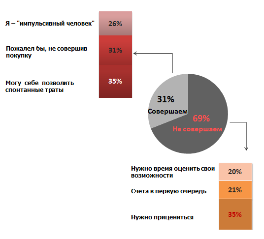 • В ответ на вопрос о причине необдуманных расходов 35% заявили, что могут себе позволить спонтанные траты, 31% признались, что пожалели бы, не совершив покупку, а 26% назвали себя "импульсивным человеком".