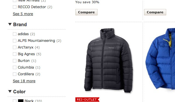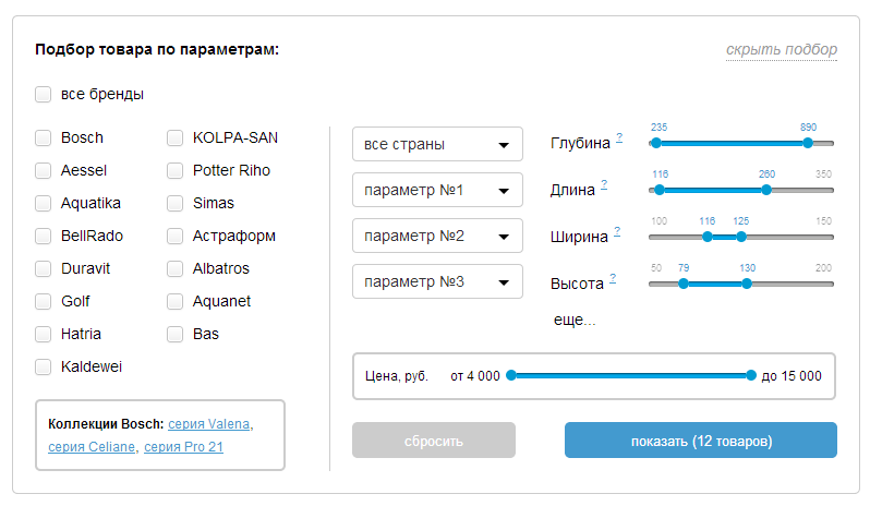 Самое главное правило - не вываливать все параметры внутри раздела сразу, показывая насколько "силен" ваш фильтр и создавая тем самым кашу из чекбоксов. Выберите наиболее ключевые и распространенные параметры (например, габариты, диагональ экрана, цвет, вкус и т.п.), которыми посетитель наверняка захочет воспользоваться и отобразите их первыми. Не рекомендуется отображать более 6-7 показателей одновременно, т.к. это может ухудшить восприятие отображаемой информации и усложнить работу с каталогом. Оставшиеся параметры есть смысл скрыть за ссылкой "Еще", которую также необходимо оформить как активный блок, тем самым дав понять, что нажав на нее произойдет какое-либо действие.