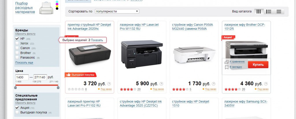 Не менее важным моментом является отображение пользователю тех параметров фильтрации, которые им сейчас выбраны и товары по которым отражаются в списке. Отличным примером может служить интернет-магазин Юлмарт, который делает темнее блоки с выбранными параметрами и даже отображает количество товаров, которые будут отображены в случае выбора более чем одного параметра (например, среди 49 принтеров марки HP по акции будет только два товара).