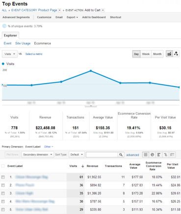 99,9% интернет-магазинов используют главную страницу в качестве маркетингового инструмента и размещает на ней блоки с акциями или распродажами. И простое размещение подобных блоков не означает, что товары будут проданы и акция привлечет к себе должное внимание посетителей. Чтобы понять это, необходимо анализировать клики и дальнейшие действия посетителей по этим блокам. Благодаря настройкам Google Analytics, вы это можете легко сделать, добавив в скрипт кода счетчика следующий интерпретатор, который будет обрабатывать события onClick по рекламным блокам на страницах: _gaq.push(['_trackEvent', 'Home Page', 'Main Promo Clickthrough', '[Promo descriptor]']); После его добавления и прошествии некоторого времени работы (Google необходимо собрать и обработать информацию с новым параметром обработки), вам необходимо зайти в Google Analytics и перейти в раздел "Содержание - События - Лучшие события" где и будут отображены ваши рекламные блоки, кол-во кликов по ним, доходность и конверсии.