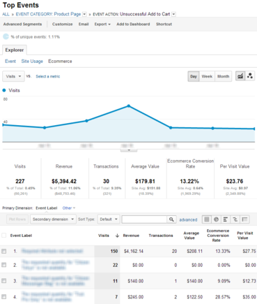 Конечно, бывает и такое - например, когда у товара стоит обязательный выбор комплектации (размер, цвет и т.п.), пользователь пытается добавить его в корзину, но вместо этого получает предупреждение о том, что сделать это невозможно по вышеуказанной причине. Отслеживать наиболее проблемные товары и выявлять общие проблемы по добавлению таких товаров в корзину вам поможет интерпретатор: _gaq.push(['_trackEvent', 'Product Page', 'Unsuccessful Add to Cart', '[Error descriptor]',1,true]);