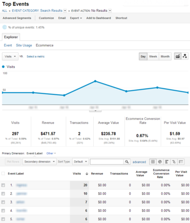 Помимо добавления в корзину, на сайте интернет-магазина есть еще уйма мест, где пользователь может споткнутся и бросить начатое, увидев окно с предупреждением о невозможности продолжить дальнейшие действия. Одними из таких мест являются страница оформления заказа, а также регистрация или авторизация на сайте. Для того, чтобы увидеть количество подобных предупреждений и их вариации, вы можете использовать следующие параметры для счетчика Google Analytcs: Для страницы "Оформить заказ" _gaq.push(['_trackEvent', 'Checkout', 'Unsuccessful Place Order', '[Error descriptor]',1,true]); Для страницы "Регистрация" _gaq.push(['_trackEvent', 'Registration Form', 'Unsuccessful Registration', '[Error descriptor]',1,true]); Для страницы "Авторизация/Вход" _gaq.push(['_trackEvent', 'Login Form', 'Unsuccessful Login', '[Error descriptor]',1,true]); Отчет будет формироваться по аналогии с отчетом ошибок при добавлении в корзину из предыдущего пункта.Поиск без результатов