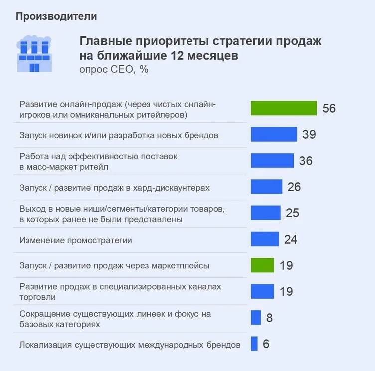 Для производителей развитие интернет-торговли стало приоритетом номер один. Они стремятся использовать этот канал не только для увеличения продаж, но и для тестирования новых продуктов, что особенно важно в условиях ускоряющейся конкуренции. В то же время ритейлеры видят в онлайн-магазинах стратегическую возможность для повышения своей прибыльности.