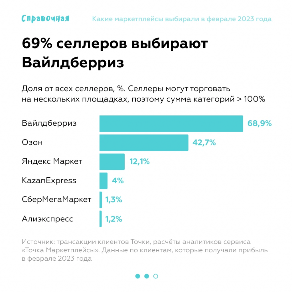 Почти 70% от всех российских селлеров торгуют на WildBerries. При этом отрыв от Ozon очень солидный, эту площадку выбирают лишь 43% селлеров. Такие данные следуют из исследования аналитиков банка Точка.