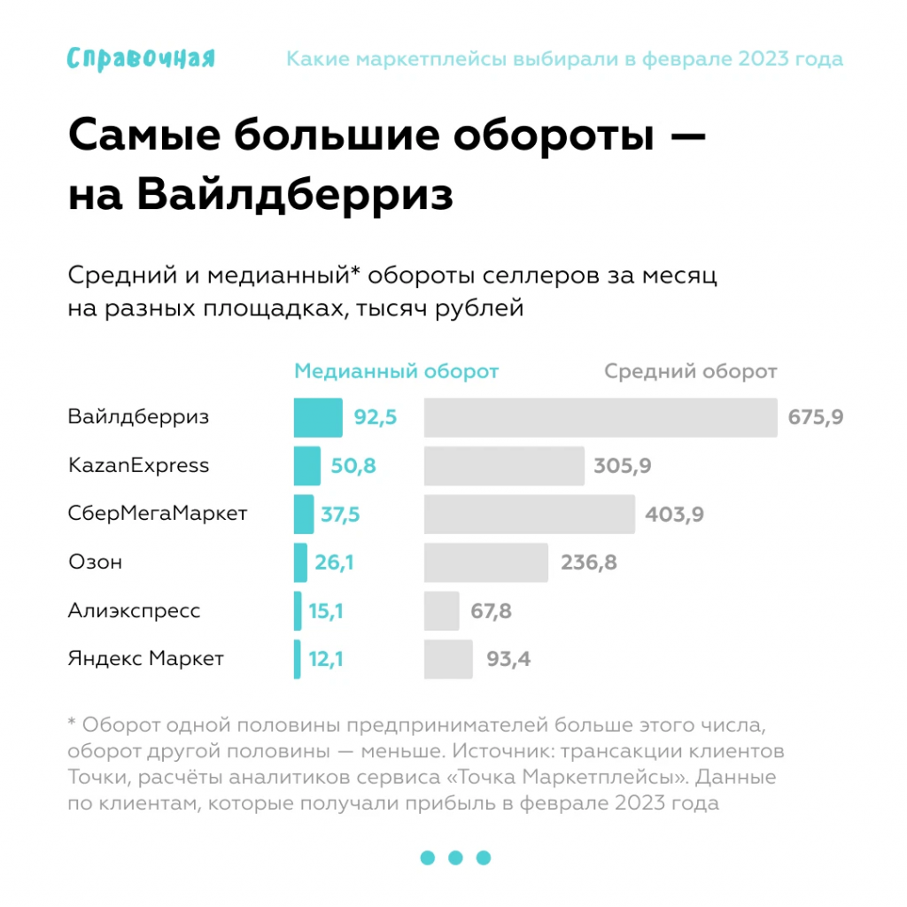 Самые большие обороты продавцов также у WildBerries. Селлер там, в среднем, продают товаров на 675 тысяч рублей в месяц. Отметим, что в расчетах использовались только данные по транзакциям клиентов банка Точка, поэтому они могут быть немного искажены.