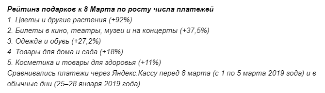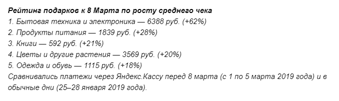 Что изучали: сравнили переходы пользователей сервиса в интернет-магазины перед 8 марта (с 1 по 5 марта 2019 года) и в обычные дни (25-28 января 2019 года).Основные выводы: Перед 8 марта пользователи проявили повышенный интерес к парфюмерии - число кликов выросло на 78% (а на пробники и тестеры парфюмерии - на 37%). Также покупатели интересовались самокатами (+64%), мягкими игрушками (+57%), умными часами и браслетами (+50%), наушниками и гарнитурами (+21%).