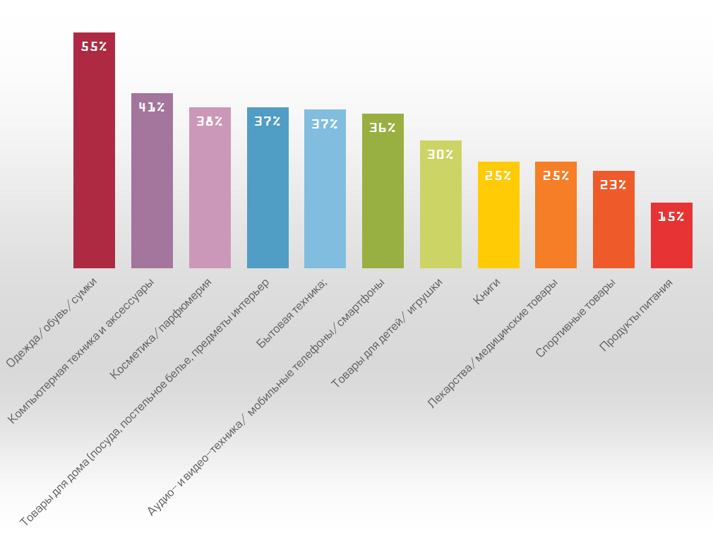 MAGRAM Market Research. Покупки совершают 88% мужчин и 93% женщин. Наибольшее число продаж зафиксировано в категории "одежда, обувь и аксессуары", в сети их покупают 55% респондентов, компьютерная техника и аксессуары (41%) и косметические товары (38% пользователей).