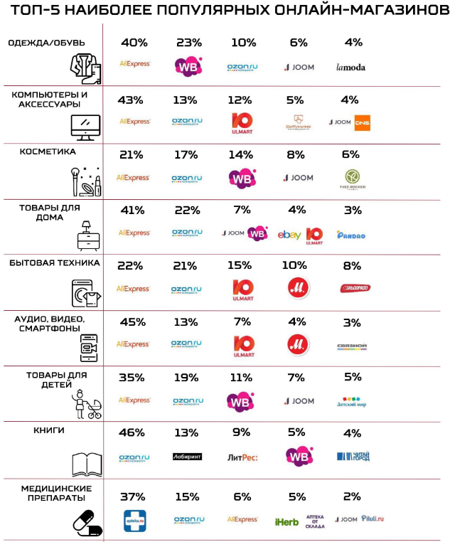 Apteka.ru (37%) и на Ozon (15%). На рынке одежды и обуви первое место занял AliExpress (40% покупок), второе у