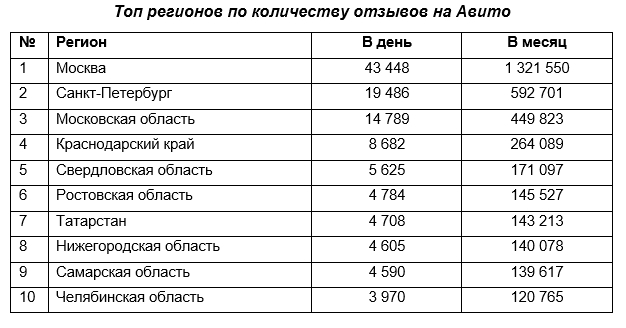 Отметим, что пользователи Авито в среднем оставляют более 191 тысячи отзывов ежедневно. Наиболее активные по этому показателю - жители Москвы (43 тысячи), Санкт-Петербурга (19 тысяч) и Московской области (14 тысяч).
