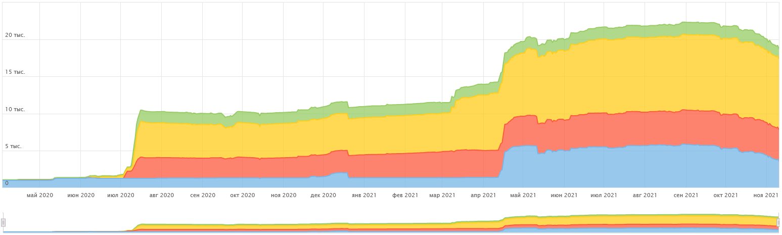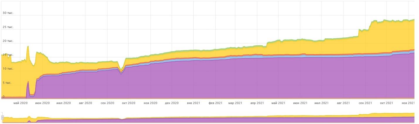 Количество страниц в индексе выросло вдвое примерно с 15 до 30. Разводящие страницы (желтый сегмент на графике) тоже стали ранжироваться значительно лучше, а они очень хорошо привлекают трафик.