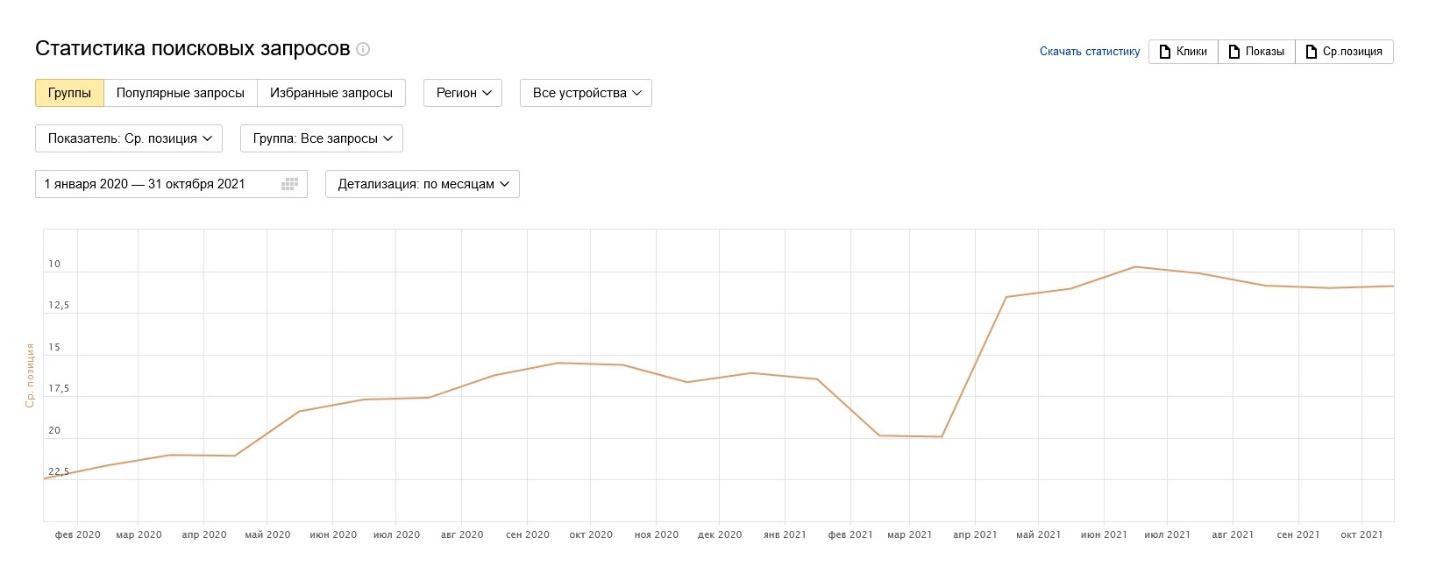 Результаты по ранжированию. Средняя позиция сайта по запросам Яндекса также выросла в 2 раза (ресурс поднялся с 20 до 10 места в выдаче).