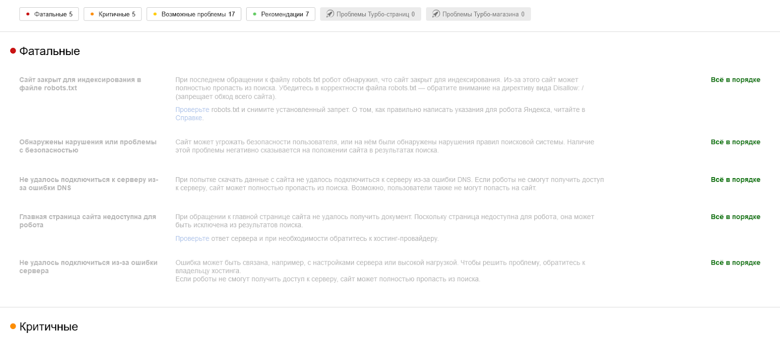У Яндекса есть градация ошибок, которые он находит на сайте: фатальные, критичные и т.д. Если подобные проблемы имеются, то система автоматически сигнализирует об этом практически в режиме реального времени. Это очень удобно, так как в случае найденной ошибки вам тут же поступит уведомление с отчетом.