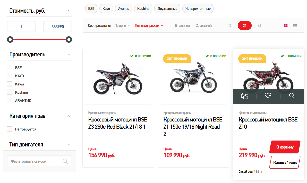 маркеры (хит/новинка/акция), зачёркнутые цены, отметки о наличии;