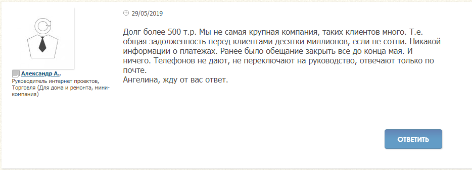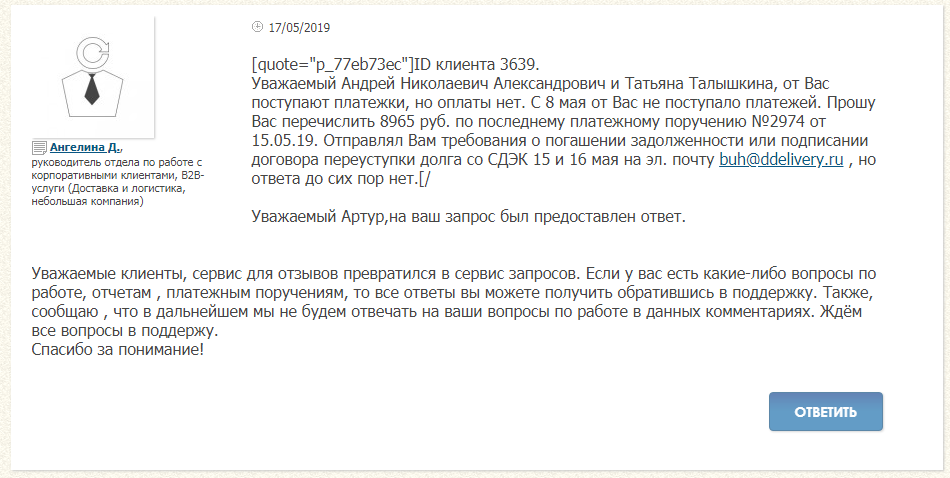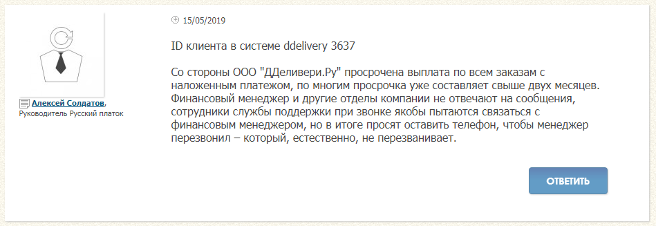 На профильных форумах в последнее время появлялись жалобы на то, что компания допускает просрочки выплат по всем заказам с наложенным платежом. Представитель компании несколько раз отвечала недовольным просьбой потерпеть, а потом сообщила, что перестаёт отвечать на запросы и отправила клиентов звонить в поддержку.