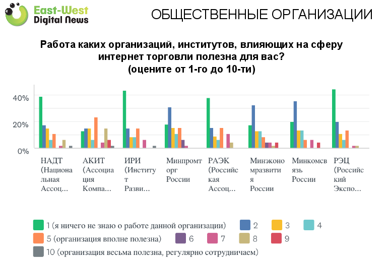 На вопрос "Работа каких организаций, институтов, влияющих на сферу интернет торговли полезна для вас?" большинство респондентов ответили, что никогда не слышали о существовании этих ассоциаций и ведомств или слышали, но считают их деятельность вредной.
