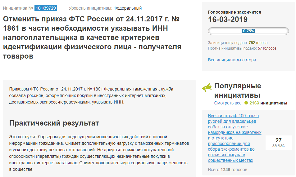 На портале Российских общественных инициатив появилось предложение об отмене обязательного внесения информации об ИНН покупателя при совершении покупок в иностранных интернет-магазинах. Инициатива № 10Ф397291 предусматривает отмену приказа ФТС России от 24 ноября 2017 г. № 1861, касающегося критериев идентификации физического лица – получателя товаров.