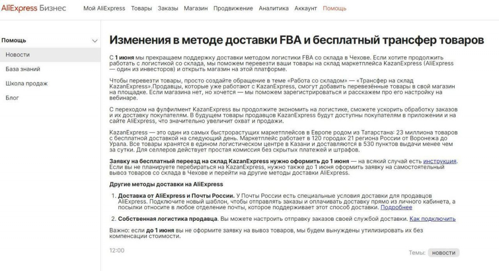 Продавцам, которые хранят товары в Чехове, должны создать заявку на бесплатное перемещение товаров на склад KazanExpress в Казани (AliExpress является одним из инвесторов KazanExpress) или самостоятельно вывезти их на собственный склад. Также можно перейти на другие способы доставки, например, через "Почту России" или с помощью собственной логистики.