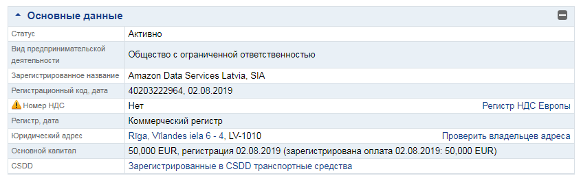 Как следует из реестра зарегистрированных компаний Латвии, 2 августа Amazon открыл предприятие с названием Amazon Data Services Latvia, SIA. Учредителем этой компании, как и в Эстонии, выступает зарегистрированная в США фирма A100 Row Inc. Уставной капитал предприятия тоже 50 000 евро.