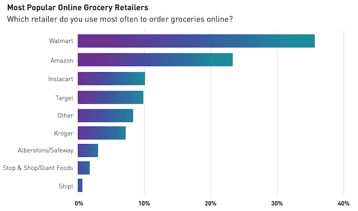 Интересно, что по недавним данным опроса Chicory, сейчас именно Walmart опережает Amazon в развитии собственного онлайн-канала, ведь его популярность как главной онлайн-площадки (правда в grocery) растёт.