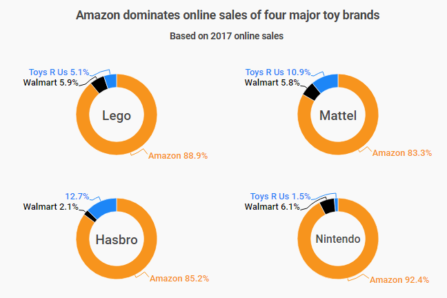 Jumpshot проанализировал онлайн-продажи четырех самых известных игрушечных брендов: Lego, Mattel, Hasbro и Nintendo. В каждом случае Amazon получала не менее 83,3% от всех онлайн-продаж. Для сравнения: продажи Toys R Us составили лишь 12,7% от всех онлайн-продаж Hasbro. В остальных брендах дела шли ещё хуже.