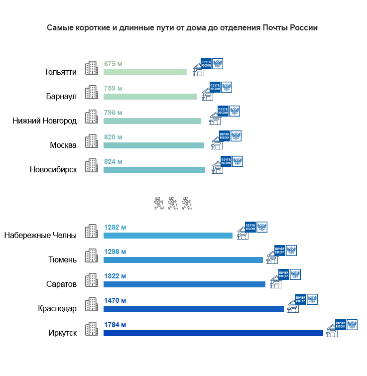 Самый короткий путь до отделения "Почты России" у жителей Тольятти. А вот дальше всех приходится добираться жителям Иркутска.
