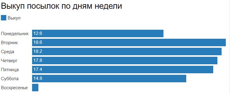 Интересно, что в целом выкуп посылок среди рабочей недели стабилен. Есть небольшая просадка в понедельник и всплеск активности во вторник. В воскресенье выкупается менее 0,5% посылок, но это связано с тем, что отделений, работающих 7 дней в неделю мало.