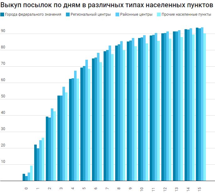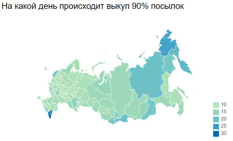 Если говорить о сроках выкупа в целом по стране, то большая часть посылок (90%+) выкупается на 11-12 день. И к тридцатому дню выкупается порядка 99,95% посылок. Большинство жителей страны стараются приходить за своими посылками сразу после их доставки в отделение "Почты России". Так, уже на 3 день больше 50% посылок обретают своих хозяев.