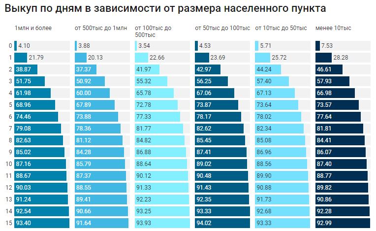 Как видно из графика, выкуп “в прочих населенных пунктах”* и “районных центрах” происходит быстрее, но только до 3-4 дня. Потом выкуп сравнивается, а далее города федерального значения (Москва, Санкт-Петербург, Севастополь) и региональный центры выходят вперед.