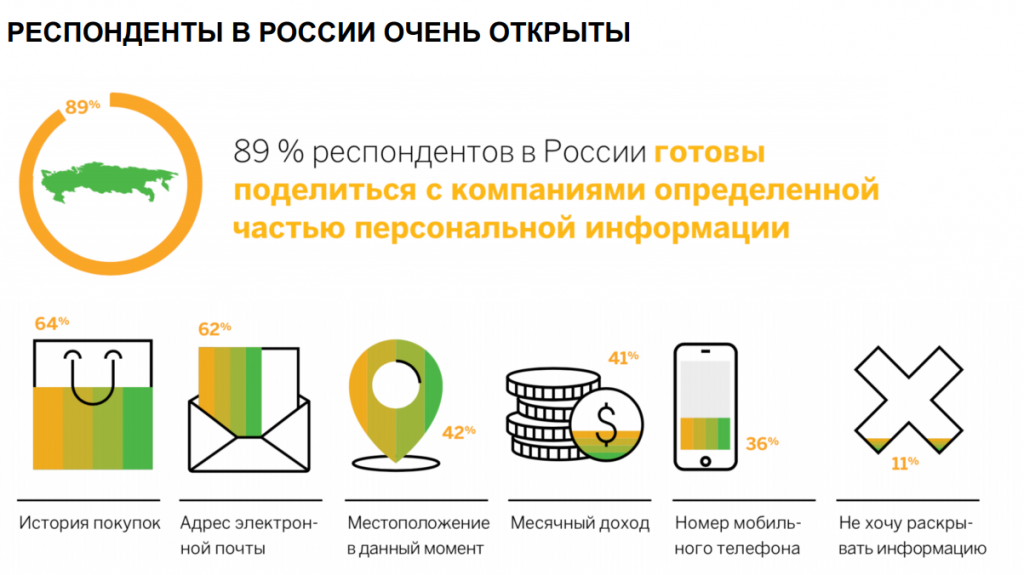 Россияне готовы предоставлять много конфиденциальных данных, типа месячного дохода, геотаргетинга и так далее. При этом в нашей стране объем потребителей, которые вообще отказываются делиться информацией, небольшой.