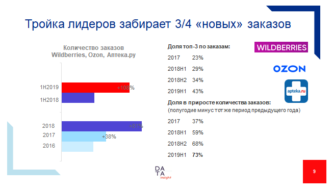 Эти слова подтверждают и аналитики. Партнер аналитического агентства Data Insight Борис Овчинников рассказывает, что рост на рынке ещё с конца прошлого года почти целиком – на 2/3 – забирается двумя крупными интернет-магазинами: Wildberries и Ozon. Именно эти два игрока "драйвят" рынок.