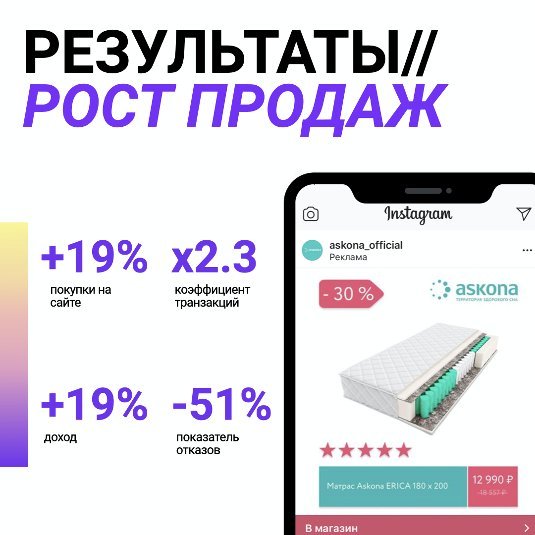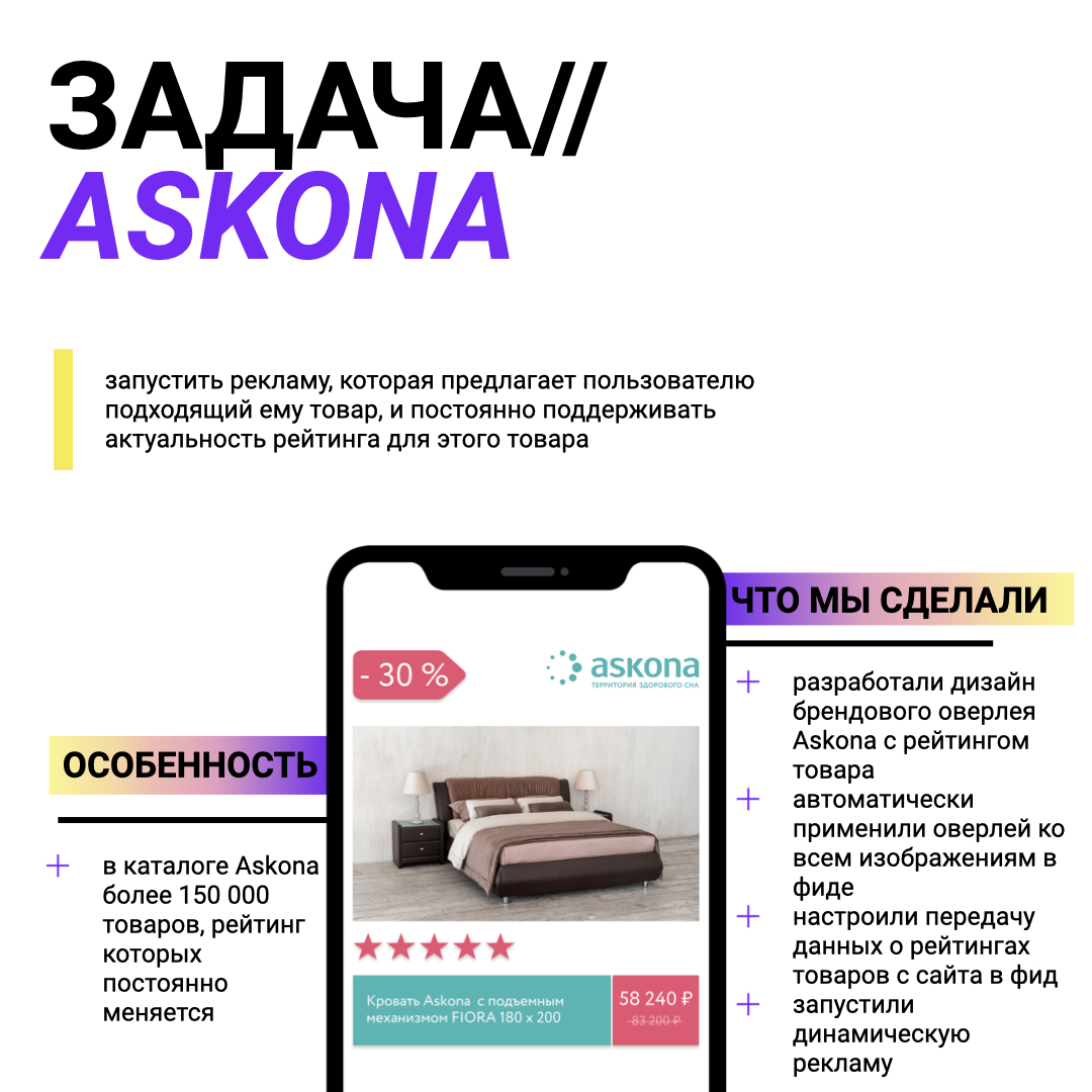 Эдуард Гвичиани, руководитель группы по таргетированной рекламе агентства iConText, о задаче Askona: «Изначально возникла потребность в улучшении визуальной составляющей динамических кампаний, так как стандартными инструментами площадки невозможно было реализовать весь информационный потенциал товаров (такие параметры, как старая/новая цена, % скидки и другие кастомизации, в том числе рейтинг на основе отзывов покупателей)».