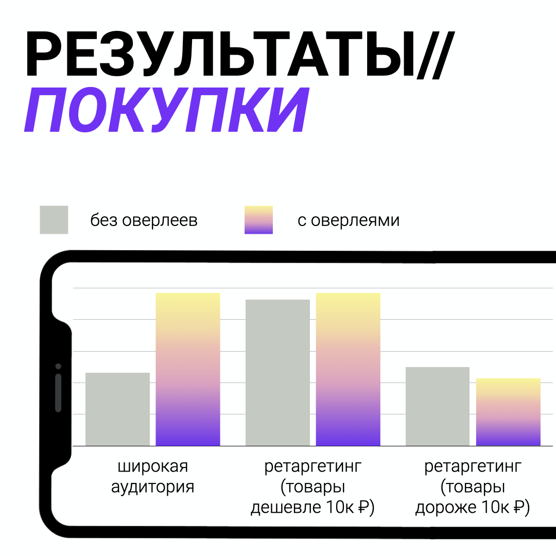 Таким образом, мы заменили только креативы в кампании на широкую аудиторию и в двух кампаниях на ретаргетинг (окно 7–14 дней, просмотр товаров дешевле и дороже 10 000 руб.) и проверили, как это влияет на метрики. Замеры проводились через две недели после старта.