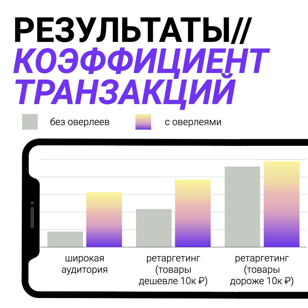 В результате по всем трем кампаниями мы заметили существенное снижение показателя отказа по переходу с рекламы – на 51% по сравнению с каталогом без оверлеев. Количество покупок при этом выросло на 19%, а коэффициент транзакций (процентная доля посещений, которые привели к покупке) – в 2.3 раза. Доход, сгенерированный объявлениями с оверлеями, также вырос на 19% при равных затратах на продвижение.