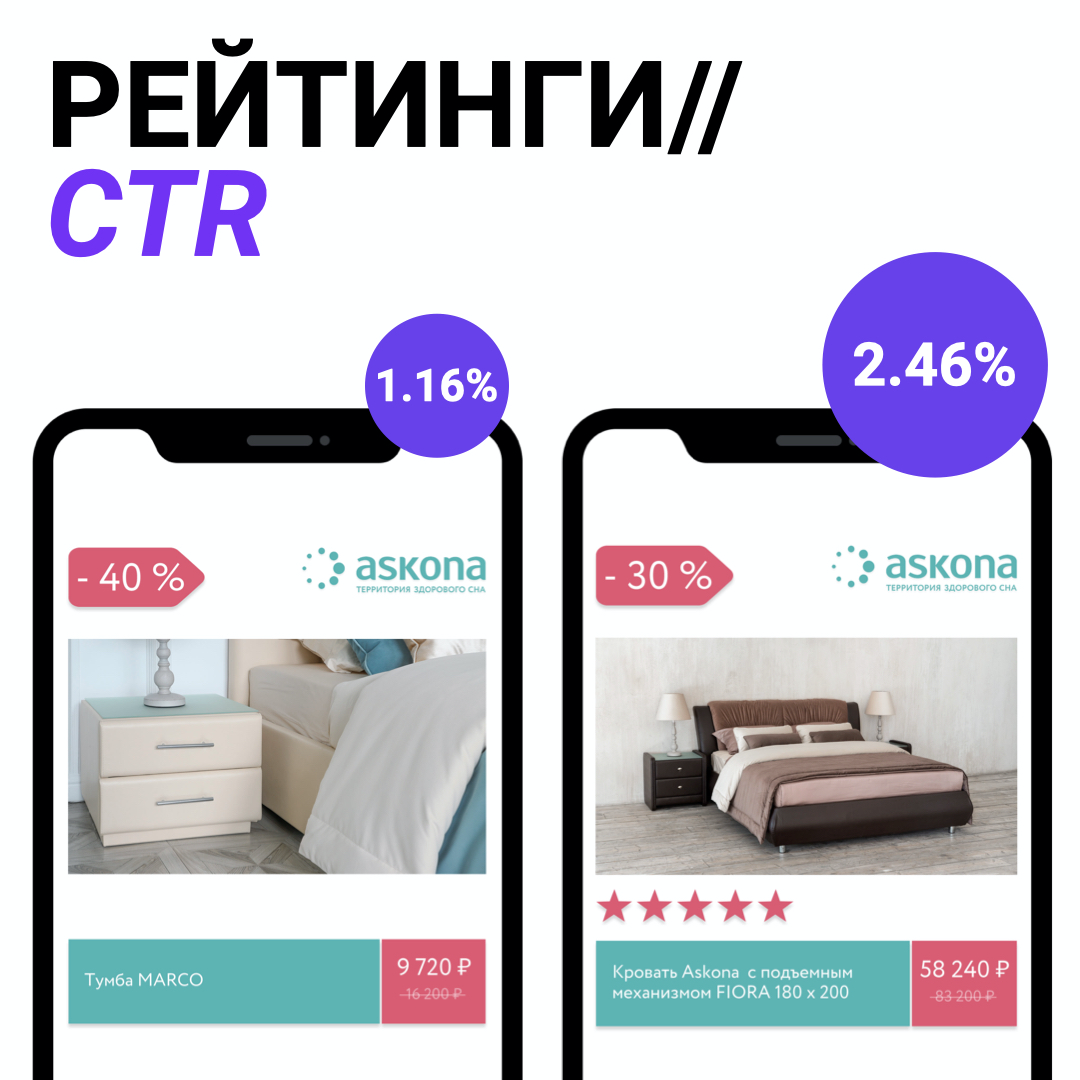 Также было интересно узнать, насколько вывод рейтинга в рекламу делает ее заметнее для пользователей. Мы сравнили CTR два типа объявлений с одинаковыми брендовыми оверлеями Askona, которые отличались друг от друга лишь наличием рейтинга товаров на креативе. Объявления со звездочками показали CTR в 2 лучше.