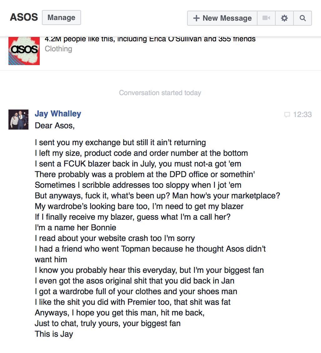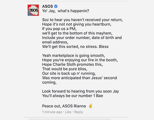 Сотрудник британского онлайн-ритейлера ASOS ответила на запрос покупателя рэпом. Как сообщил на своей странице в Facebook Джей Уолли, он обратился в службу поддержки с жалобой, составив оригинальное письмо в стиле рэпера Эминема и получил аналогичный ответ.