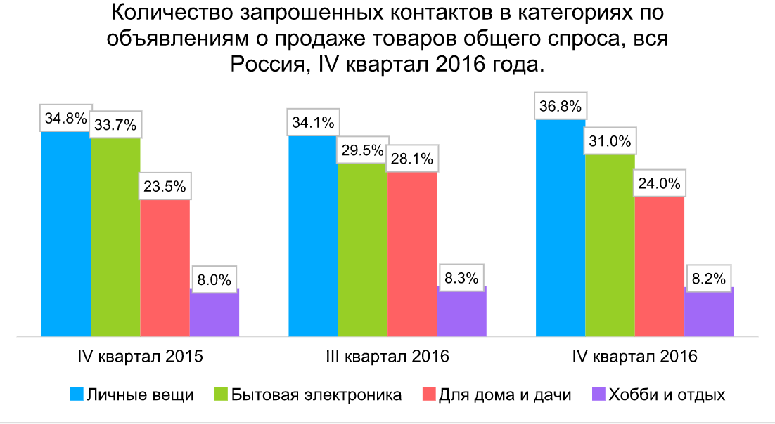 Специалисты онлайн-сервиса частных объявлений Avito проанализировали спрос на потребительские товары. По данным исследования, в четвертом квартале 2016 года количество запрошенных контактов по объявлениям выросло на 34% по сравнению с аналогичным периодом прошлого года.