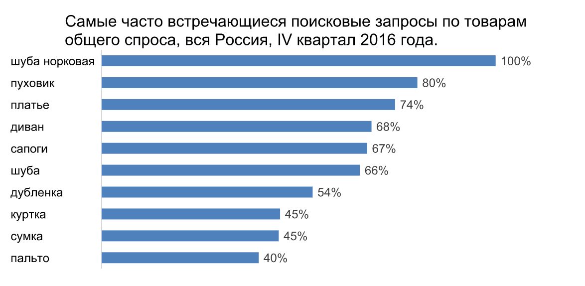 Жители России чаще всего искали объявления о продаже одежды: норковых шуб, пуховиков, а также платьев. В десятке наиболее популярных запросов только два не имеют отношения к этой категории – «диван» и «сумка».